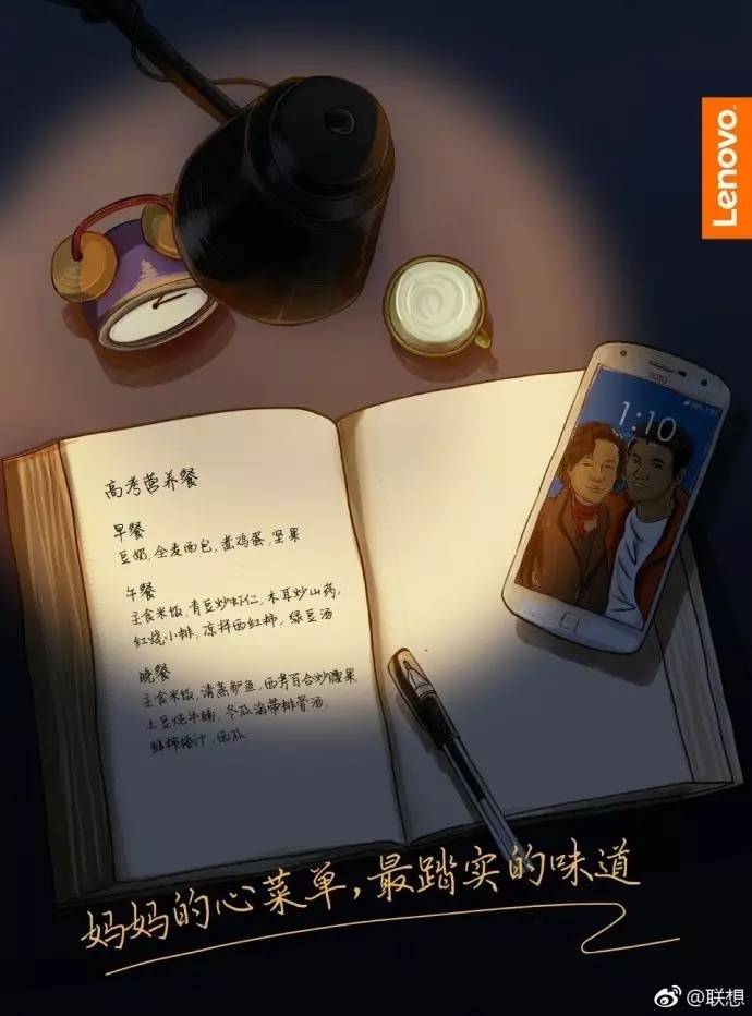 这三张海报以暖色调烘托出家庭的温馨。妈妈的爱和她从未说出口的话,写在四季三餐的“心”食谱;考生斑斓精彩的梦想,即将盛放。而联想巧妙地将品牌名称拆分成“联接你的梦想”,让人想到联想和关爱连接了考生的梦想。