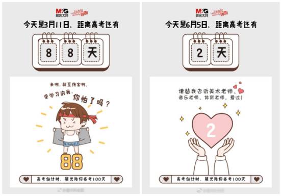 和高考联系密切的文具品牌在高考季的营销也不断翻新。以国产品牌晨光为例。今年的高考季,晨光以陪伴为主题开展了倒计时100天的营销。
