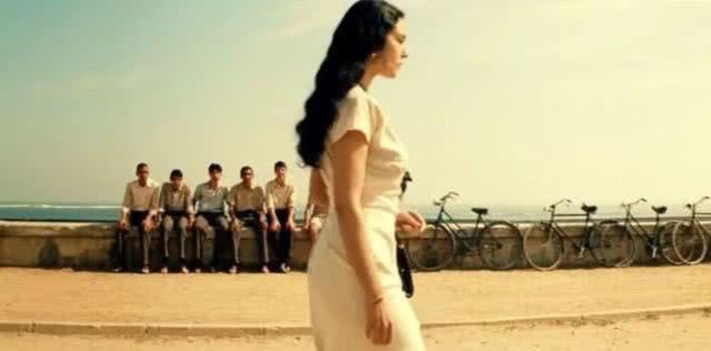 在影片的开始部分,玛莲娜穿着白色的套装,披着乌黑的头发,风姿摇曳地走过街道。