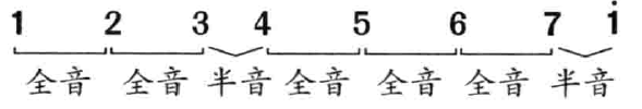 “半音”是相对于“全音”而言的。在七个音符中除了3 - 4和7 - 1是半音关系之外,其他相邻的音都是全音关系。下面这个图示非常清楚地表明了七个音之间的关系。