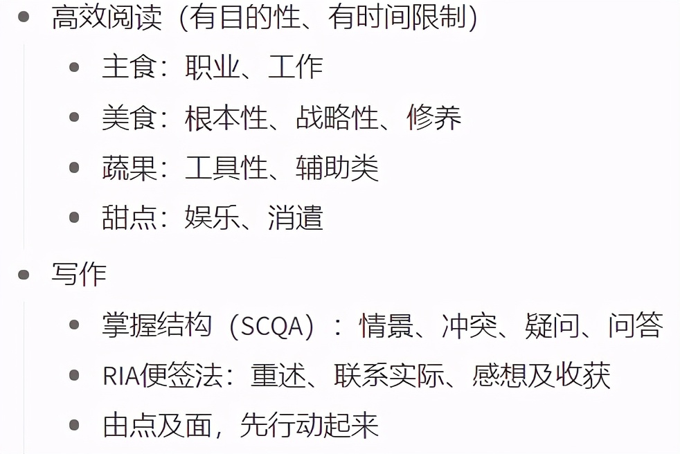 - 4.碎片化时代获取知识需要我们建立知识的获取、分类、整理的最小单位,如ria读书法、知识卡片法。
