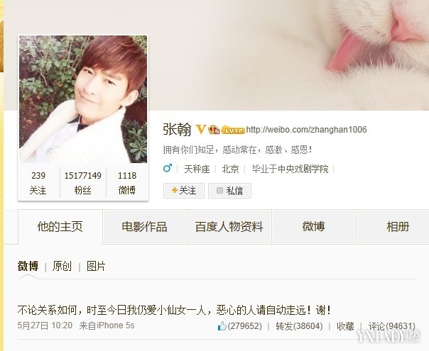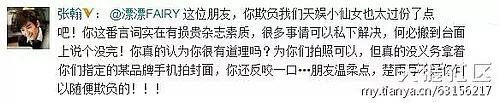 张翰冲冠一怒为红颜,在微博中澄清说:“你欺负我们天娱小仙女也太过份了点吧!很多事情可以私下解决,何必搬到台面上说个没完!你真的认为你很有道理吗?为你们拍照可以,但真的没义务拿着你们指定的某品牌手机拍封面,你还反咬一口?朋友温柔点,楚雨荨不是你可以随便欺负的!”