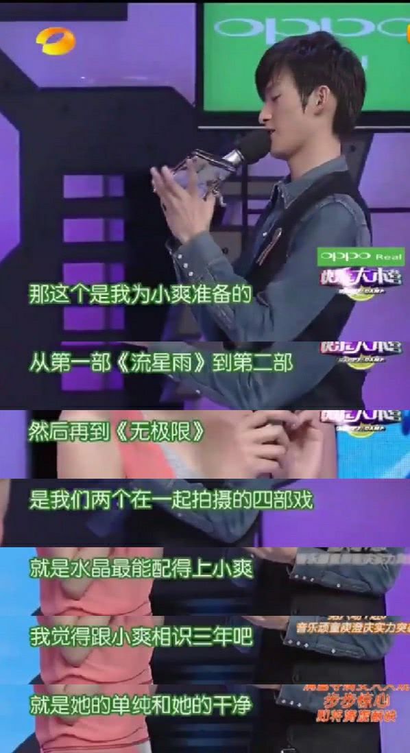 2010年8月14日的《快乐大本营》记录下俩人全场目光交织,十指紧扣的甜蜜状态,何炅打趣道:“他们已经不关心我们怎样了,因为他们有自己的世界。”