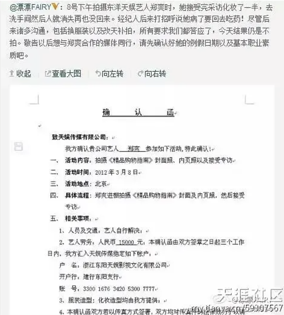 2012年,《精品购物指南》编辑爆料郑爽“妆化到一半突然消失,也不补拍”,直接在网上炮轰她。