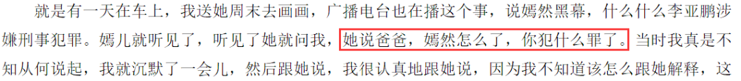 听到广播的李亚鹏独自苦笑,她身旁的女儿李嫣扭过头问她:“爸爸,这说的是你吗?你犯什么罪了?”