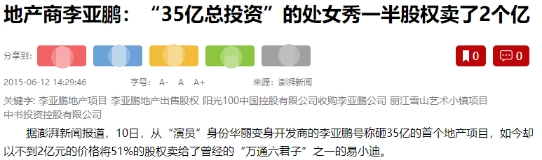 媒体还曝出过其他类似的例子,比如李亚鹏进军房地产,投资了35亿,结果操作不当,只得以2亿贱卖了一半股份。