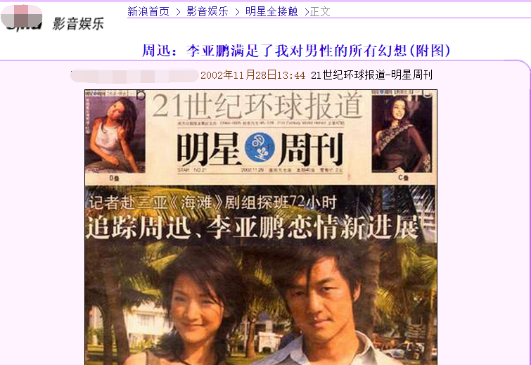 2002年,李亚鹏出演《射雕英雄传》,和扮演黄蓉的周迅相爱了,李亚鹏身体强壮,体贴温柔,相貌英俊,周迅说他满足了自己对男性的全部幻想。