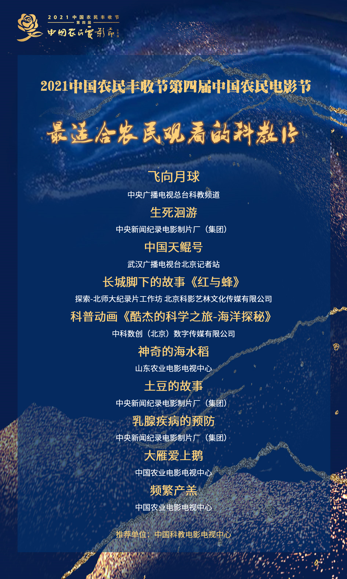 为了向国际国内广大受众讲好中国扶贫脱贫故事,充分展示脱贫攻坚取得的辉煌成就,激发广大干部群众积极投身乡村振兴事业、奋进新征程,中国电影家协会主办了2021年中国农民丰收节的重要活动 “2021脱贫攻坚主题电影推荐活动”,推选出10部展现扶贫干部和群众感人事迹和崇高精神的优秀故事片,分别是:《千顷澄碧的时代》、《我的父亲焦裕禄》、《青春作伴好还乡》、《我和我的家乡》、《一点就到家》、《又是一年三月三》、《春天的约定》、《扶贫主任》、《伊水栾山》、《后池新愚公》。