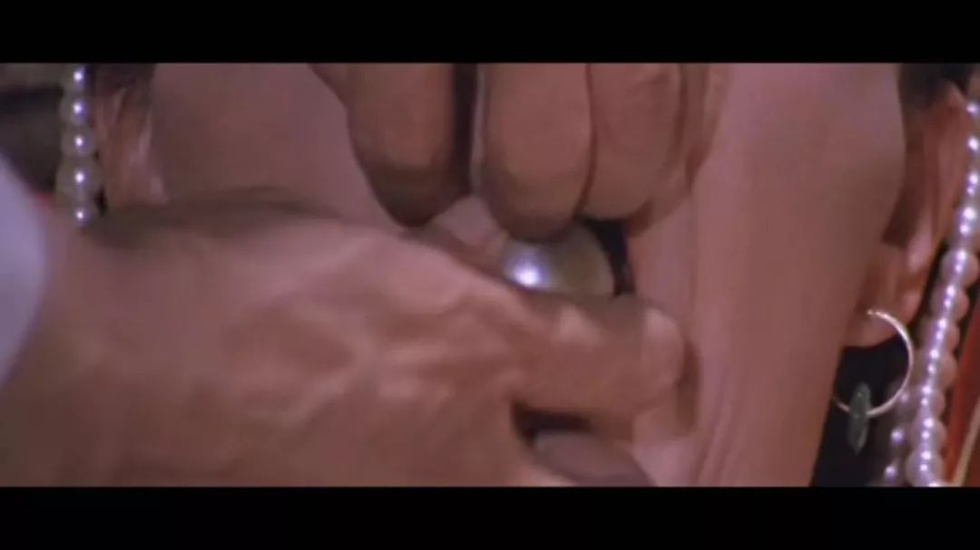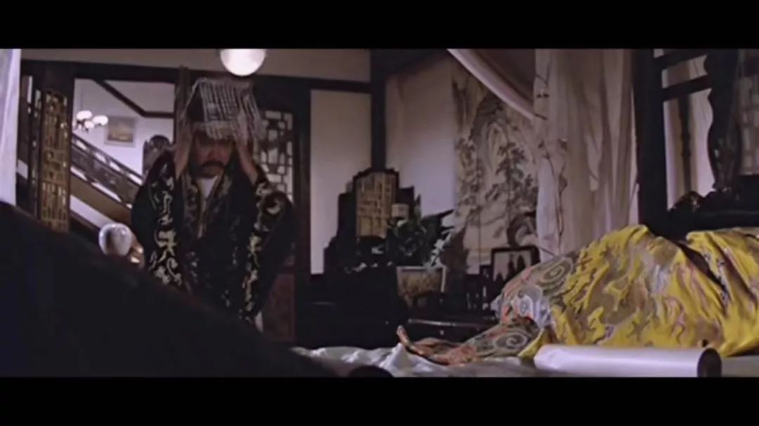 这一段剧情是小妾在偷情,狄娜在此片中贡献了著名的露背镜头——被李翰祥忽悠的。李翰祥为了让狄娜脱衣服,跟狄娜说的版本是,镜头会离得很远,而且会隔层纱,就比如上面那个角度。然而,实际上……