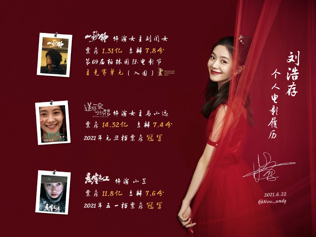 一炮而红的刘浩存也由此正式进入演艺圈,按照进入演艺圈的时间来算,刘浩存还是一个新人,但可以与很多明星大腕合作。在短短的两年内为观众呈现了多个活灵活现的角色,《送你一朵小红花》、《四海》、《悬崖之上》每一部都是经典。