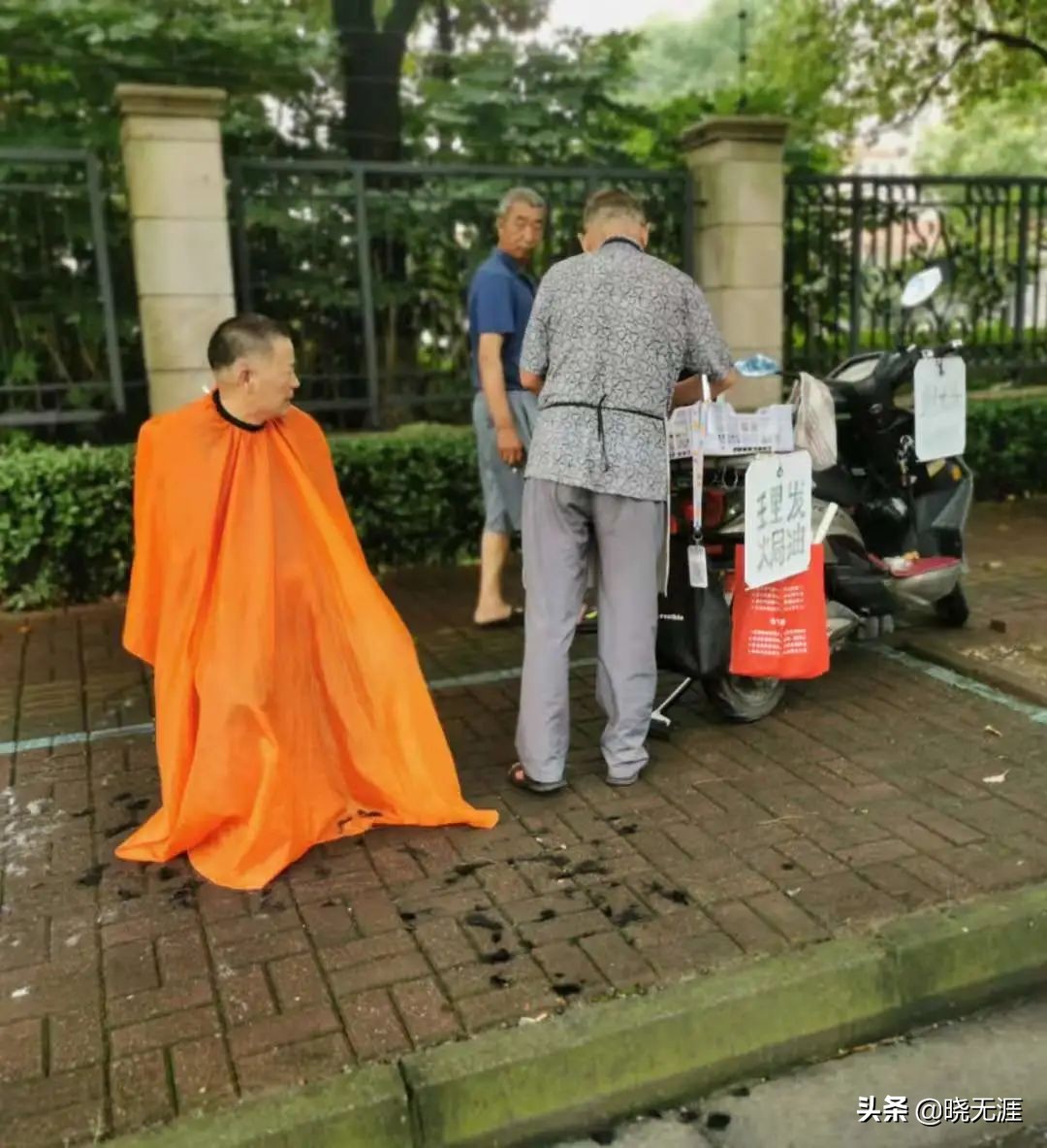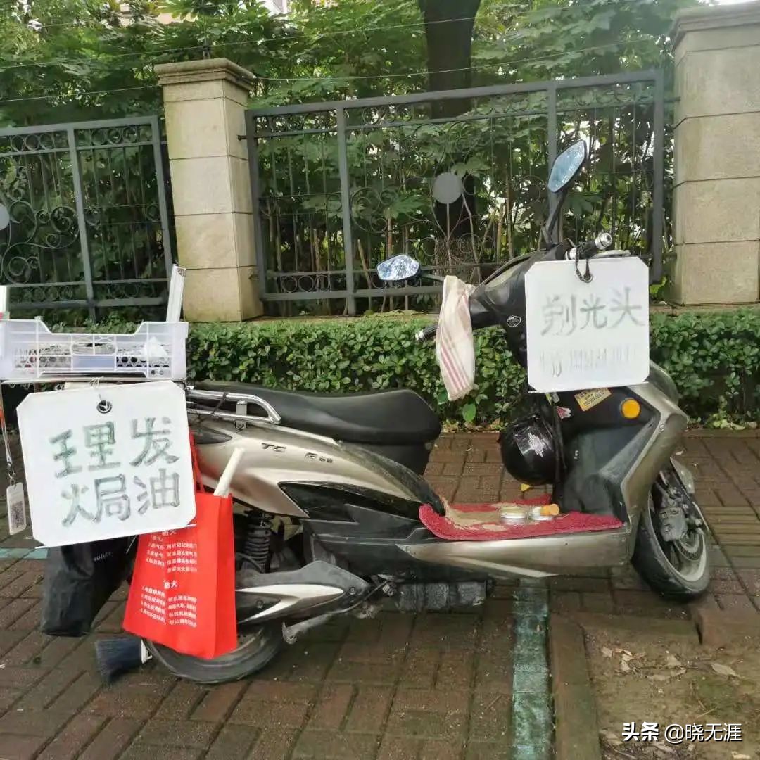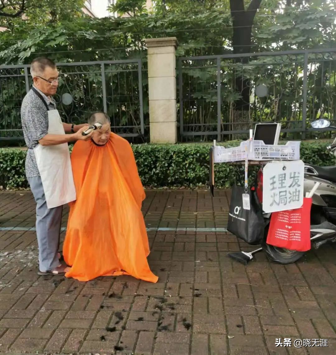 我边走边看,边看边走,离菜市场大概100米的样子,一位老大爷端坐在一张塑料凳上,围一件橙色的理发围布,等待着理发师给他理发,而旁边和他年纪差不多的大爷正在电动车上准备工具,引的路边一众大爷驻足回望。我再看那电动车,分别在车头和车尾都挂了牌子,一边写道:理发焗油,一边写着:剃光头,下面跟着电话号码。
