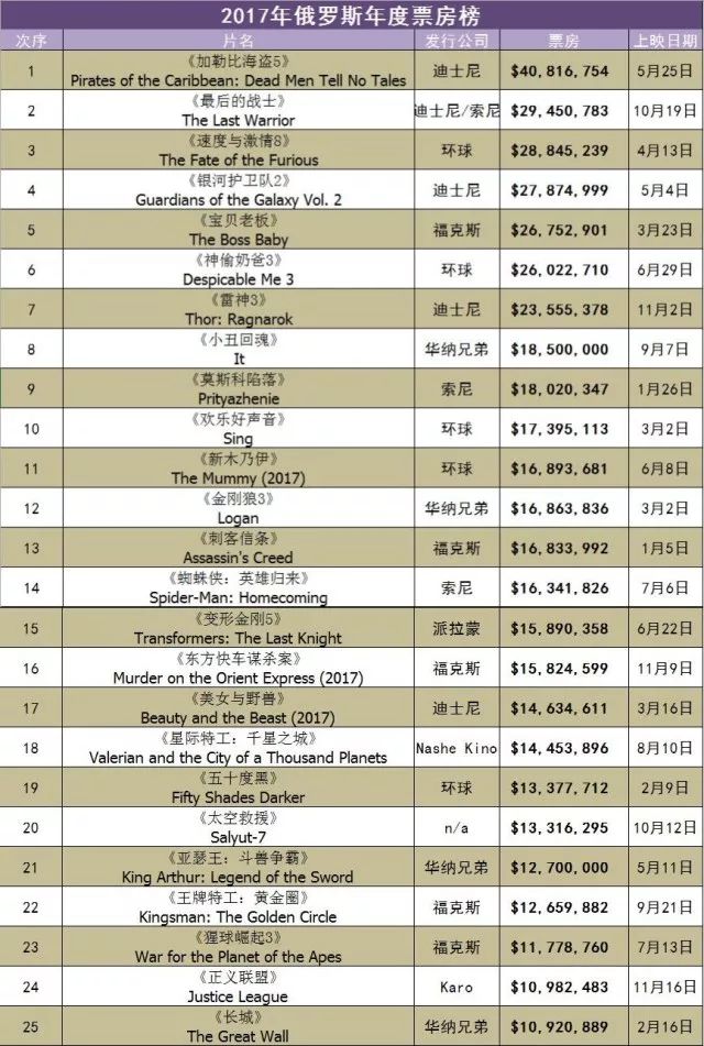 俄罗斯本土影片的情况比较复杂,最受欢迎的影片是《最后的战士》(Последний богатырь),这是一部集合了当地民间传说的幻想喜剧片,由迪士尼(经过7年的放置,重新开始用当地语言制作)。这部影片在10月份发行,票房超过了费奥多·邦达尔丘克(fyodor bondarchuk)的《斯大林格勒》(stalingrad),成为俄罗斯史上票房最高的本土影片,该片的俄罗斯总票房为2945万美元。在年度票房榜单上排在第二名,领先于第三名《速度与激情8》。邦达尔丘克的最新一部科幻惊悚片《莫斯科陷落》(attraction),在2017年年初通过索尼公司发行,同样票房成绩不错,为1800万美元,并进入前10名,排在第9名。
