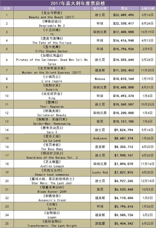 意大利2017 年票房排行榜显示出了女性在电影中的不同力量。第一名是《美女与野兽》(2269万美元),艾玛·沃特森(emma watson)主演的公主纯洁而纯粹。与之相反的是,《神奇女侠》中的亚马逊超级英雄对意大利观众的吸引力要低于其他的地区,这部电影排在第39名,当地票房只有390万美元。