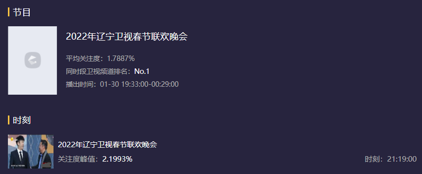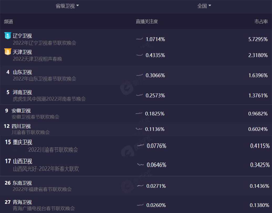 辽宁春晚早就出圈了!辽宁台自然也是这一晚收视表现最好的电视台了,反超湖南台拿下同时段卫视排名第一,开播15分钟收视就成功破1。