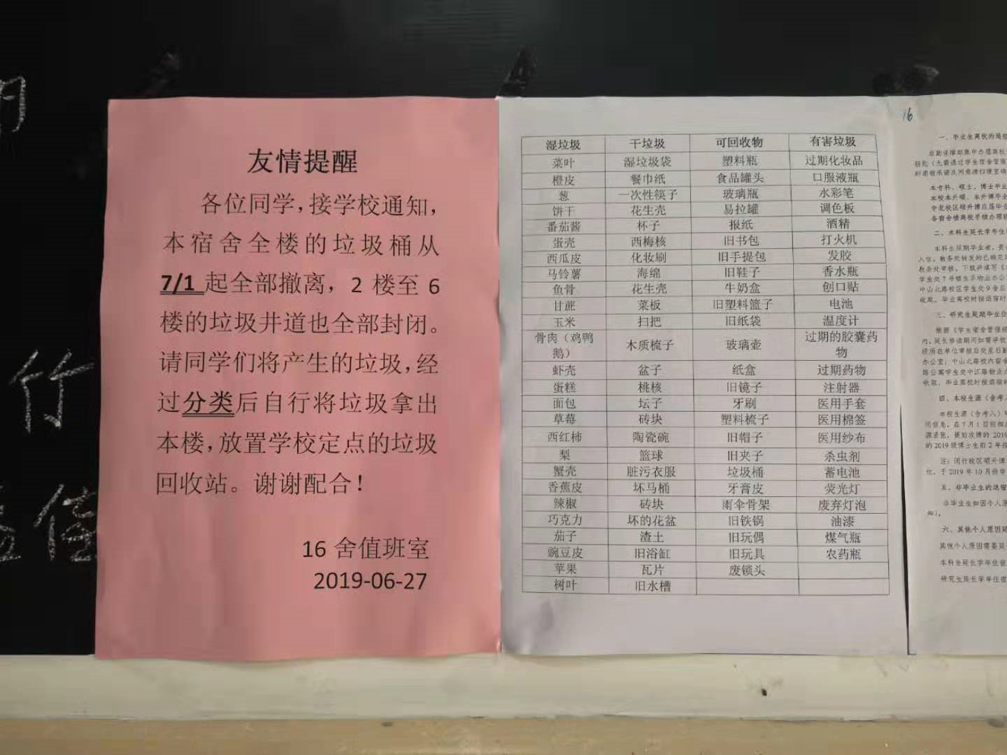 学校是备战垃圾分类的重要战场,27号学校张贴通知,宣布7月1日起,垃圾道将全部封闭,垃圾应自行分类后,放置到学校指定的回收站内。在此之前,校内已经有很多预热活动,比如说学校的公众号发布了垃圾分类的相关讲解,同时也发布了一些新的政策,比如不再主动无偿提供一次性餐具等。一些社团也举办了垃圾分类知识大赛。