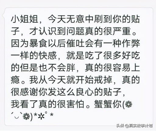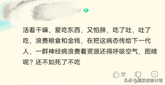 他就是在这种煎熬下,自发领悟了催吐的奥义。一次吃饱后他后悔了,脑子里冒出来一个想法:“瘦不下来又忍不住不吃,那吃饱了再吐掉,就两全其美了?”