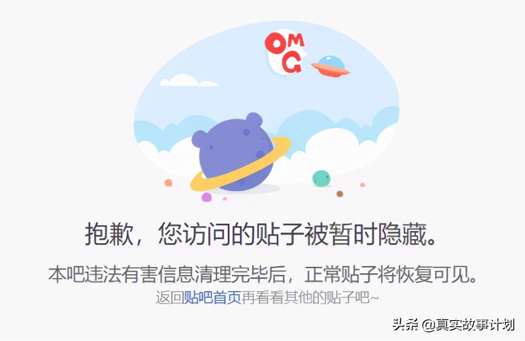 “抱歉,该贴吧有大量违规内容,暂不开放哦”,贴吧主页这样显示。从主页点进我曾发言的帖子,提示的则是“违法有害信息清理完毕后,正常帖子将恢复可见”。