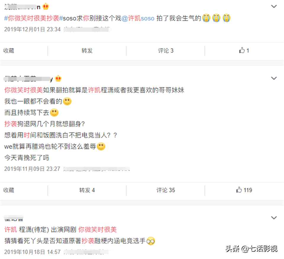 《你微笑时很美》原著遭到电竞粉的抵制,翻拍消息传出之后,网友们也展开过一定抵制行动,许凯、程潇两位主演都被建议过拒接该作品。