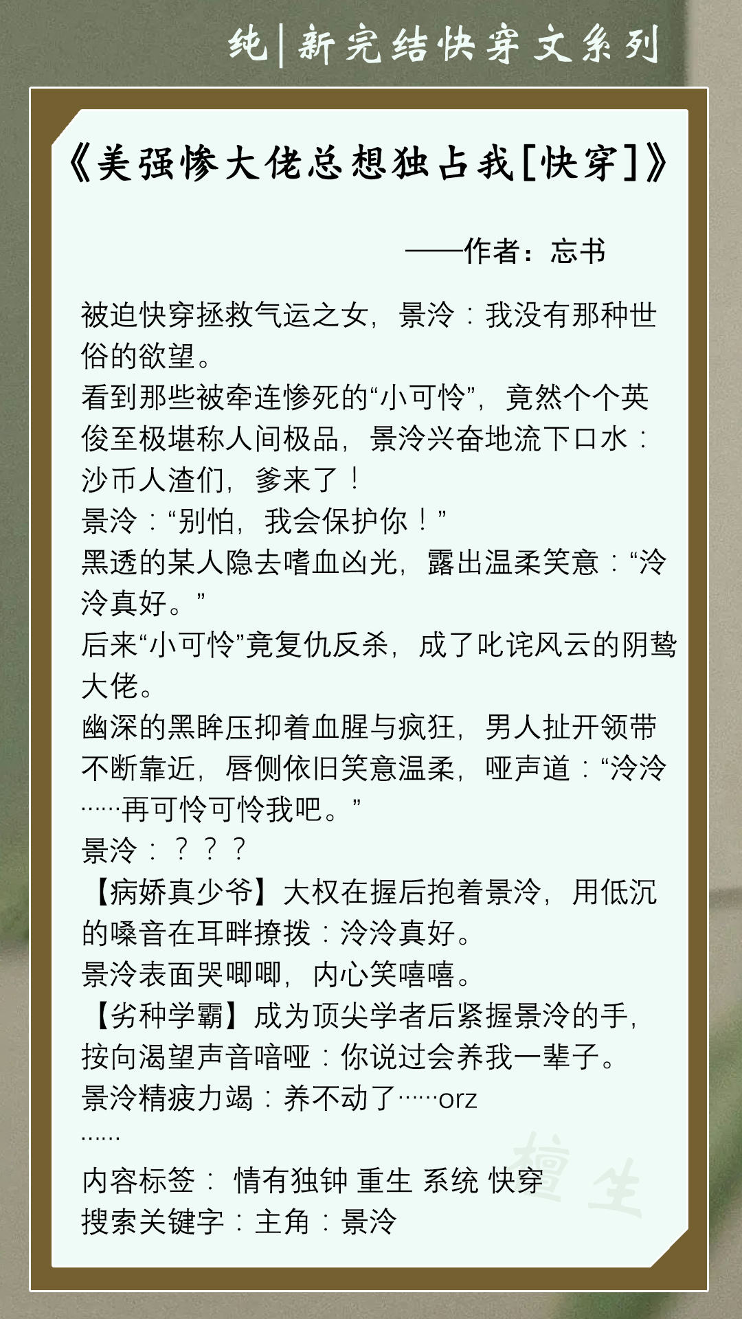 短评:男主景泠为了活命,带着系统穿到不同世界里拯救“气运之女”的故事。他的任务对象是那些本该幸福美满,却被恶意掠夺气运最终结局凄惨的姑娘们,剧情以打脸虐渣为主线,但恋爱日常占大篇幅,撩到飞起。男主本体白孔雀,另一主角时凛是轮回之渊,每个小故事里扮演美强惨大佬,两人有宿命羁绊,感情线从一而终。作品文笔剧情流畅,小推。