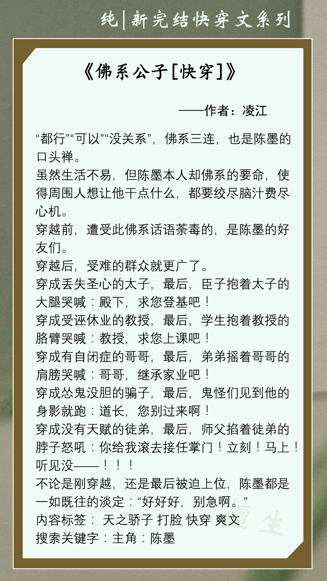 短评:又是一篇无cp向快穿文,男主陈墨以佛系公子的姿态,穿越到小世界里继续当闲云野鹤的故事。男主佛起来,反派都替他着急,口头禅是“都行,可以,没关系”三连击,叫他搞事情,他只会在一旁淡定吃瓜当群众,偏偏这种姿态,却总能苟到最后当赢家。这篇文个人观感不太可,剧情浅白,权谋写得弱,打脸套路很模板,但是收藏很高,喜欢的可以一试。