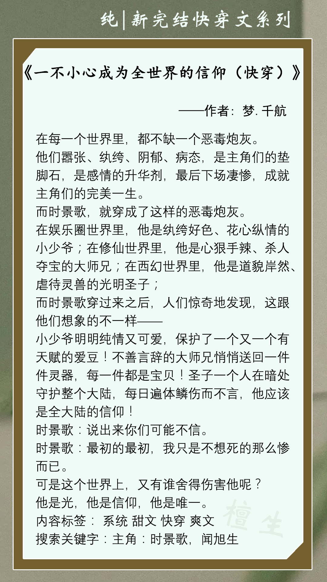 短评:男主时景歌穿越到三千世界里进行洗白任务的故事。开局恶毒炮灰,结局变成全世界信仰,全凭男主sao操作扭转剧情,一群人自动脑补,用爱的供养把男主捧上神坛。另一主角闻旭生和男主一样是神仙,感情线双箭头奔赴,每个小单元都进展神速,一眼定情,然后强力打辅助。作者的文笔有点小白,不过剧情很爽,个人建议阅读。