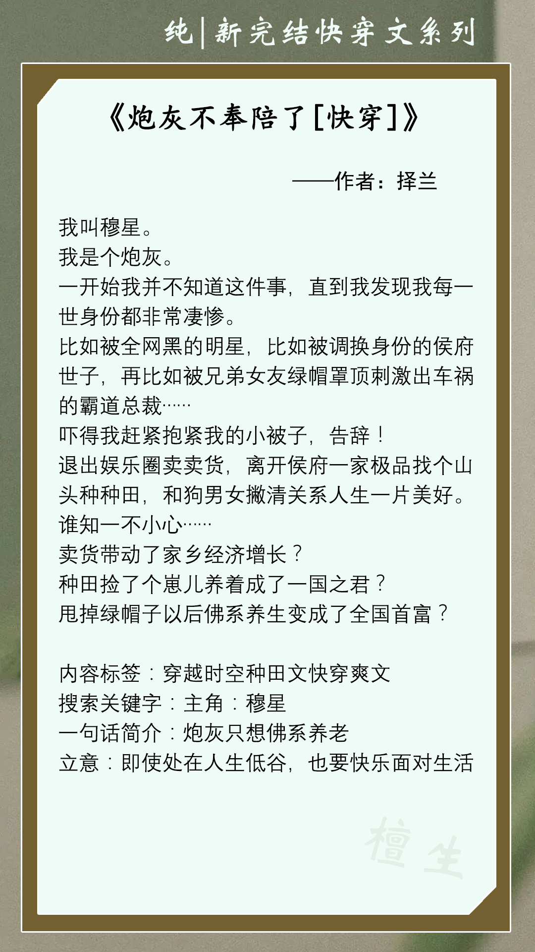 短评:无cp向快穿文,男主穆星穿越到各个小位面里充当凄风苦雨小炮灰的故事。男主远离剧情是非,好好生活,绽放自我,用豁达的价值观闯出自己的一片天。开局拿着最凄惨的炮灰剧本,结局活出肆意洒脱的人生。个人很喜欢这种舒缓轻松风格的快穿文,剧情线没什么惊天阴谋,不黏乎不狗血,主角可爱又强大,佛系又不怕事,高情商解决一切困难,很棒!
