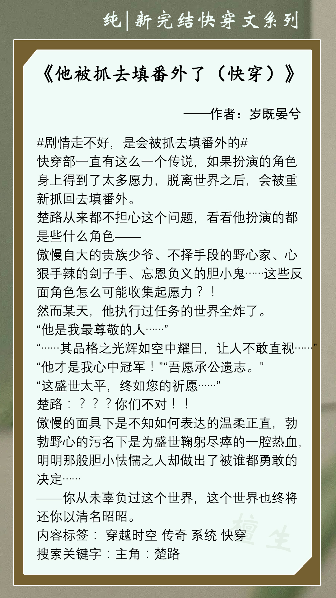 短评:无cp向快穿文,就职于时空局的男主楚路在完成剧情后又被拉回各个小世界里,继续填补番外的故事。开局男主是各路反派角色,结局却成了小世界里的白月光,每个人坚信他另有苦衷,脑补一出大戏替男主这个大反派洗白,接他来番外“享福”。这篇文的题材新颖,人物刻画饱满立体,很多奇奇怪怪的脑洞撞在一起,发酵神奇的事件来,令人忍俊不禁。