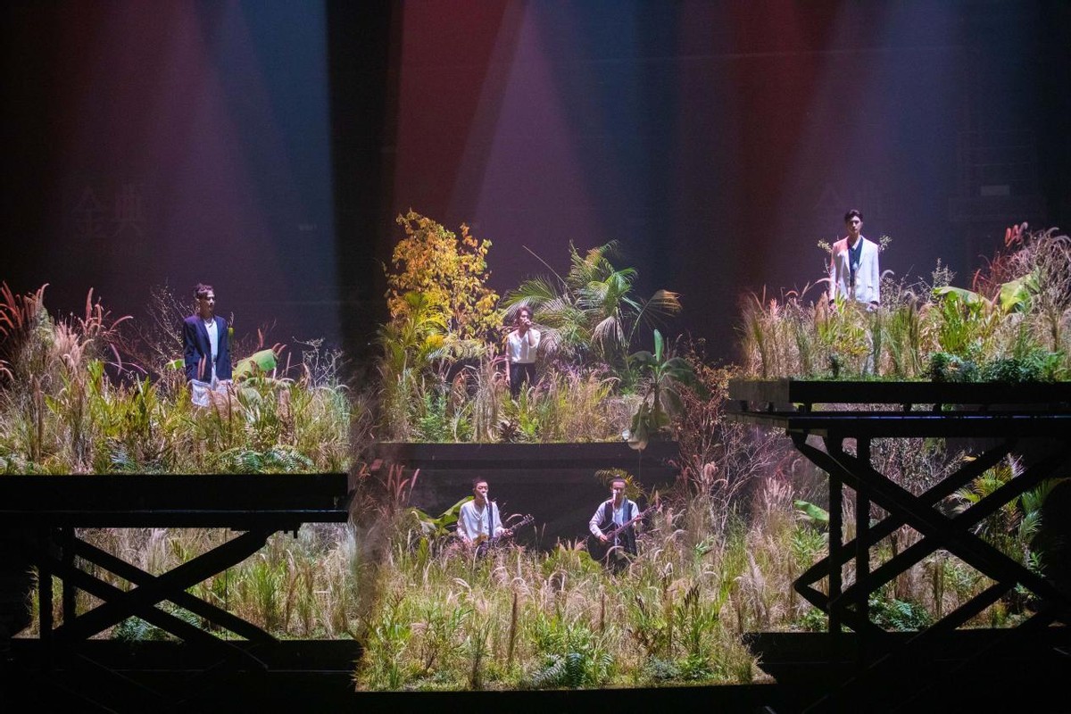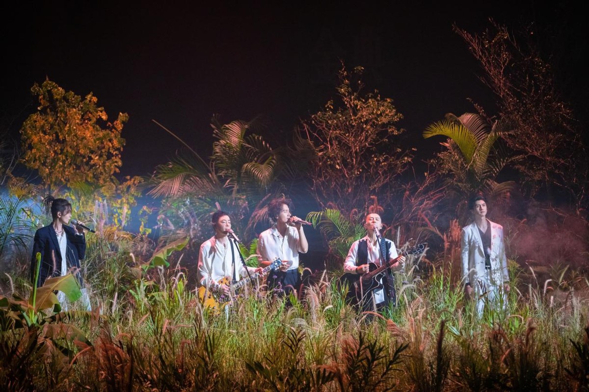 陈辉部落的《凄美地》舞台则采用实景丛林,将“绿野仙踪”搬到了观众的眼前,陈辉携黄贯中、言承旭、张云龙、刘端端五位哥哥身穿黑白穿搭,站在丛林之中温柔唱歌的画面可谓是非常养眼。