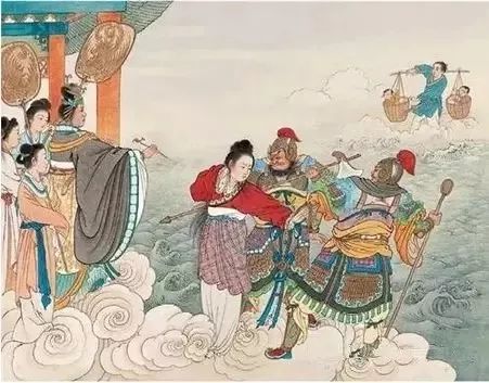 10、忽一日,王母娘娘闻得织女已到下界与牛郎结婚,心中大怒,即刻派金甲二神到人间将她捉拿归天。此时牛郎正好不在家,这可急坏了织女。