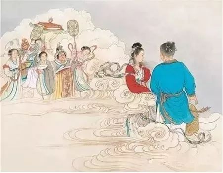 5、次日,牛郎来到瑶池,果见众仙女在水中嘻戏。其中一个姑娘愁眉紧锁,正是他日思夜想的织女。