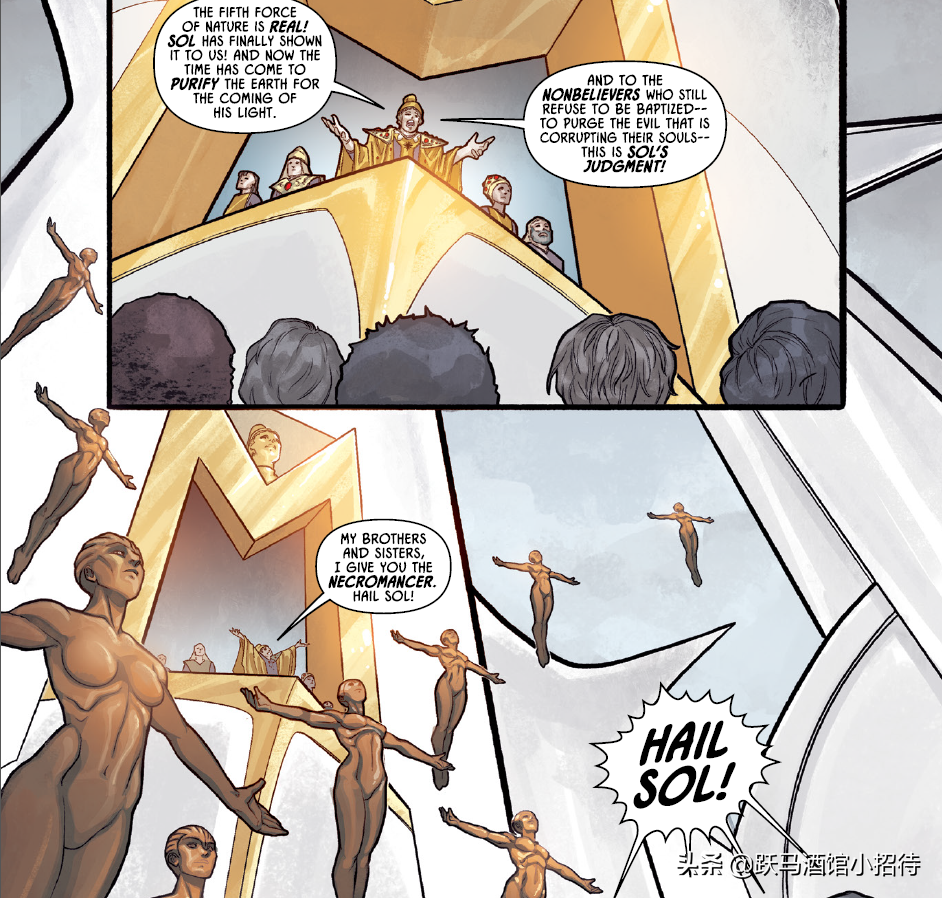 周围的那些“人”看上去都穿着斗篷,遮住了脸和身体,无法分辨他们的身份。不过从展现的画面中看,他们像是在朝拜着这个多边形容器和里面的“生物”。这很可能暗示人类发现了这种抵达地球的容器和其背后隐藏的秘密,随后密特拉教便在地球兴起。