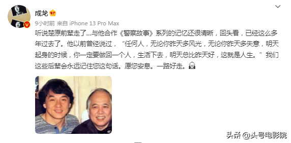 “听说楚原前辈走了…与他合作《警察故事》系列的记忆还很清晰,回头看,已经这么多年过去了。他以前曾经说过,‘任何人,无论你昨天多风光,无论你昨天多失意,明天起身的时候,你一定要做回一个人,生活下去,明天总比昨天好,这就是人生。’我们这些后辈会永远记住您这句话。愿您安息。一路好走。”