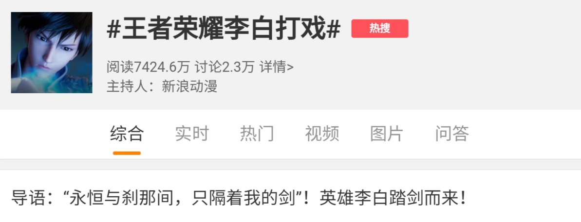 《王者荣耀》最大的吸睛点,还是几个角色,还是凯、百里守约和李白的人气。所以说《王者荣耀》动画制作组其实还是很懂观众心,并不一味炫技做群像剧,而是抓住几个高人气角色去褥。但问题又来了,凯、百里守约和李白的人气,能够打败人气国漫角色吗?其实也是比较难的。微博话题“王者荣耀李白打戏”,基本上把动画番剧的所有人气牌都打出来了,结果只有七千多万的阅读,2.3万的讨论。