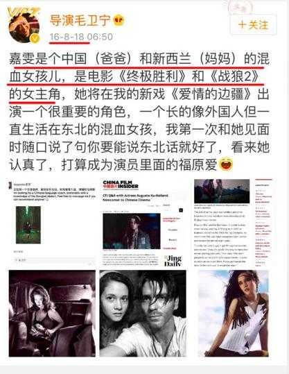 而且还有人扒出了徐嘉雯和吴京一起面试黑人小演员的路透,16年的时候,毛卫宁导演也发博透露过,徐嘉雯要在电影《战狼2》中饰演女主,但后面这个角色突然就换成了卢靖姗出演。