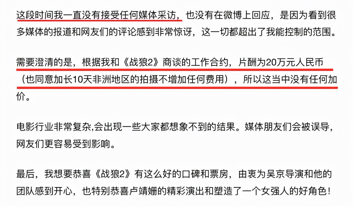 而在《战狼2》的发布会上,吴京透露在开拍前原定女主的经纪人突然要求加片酬,不然就不演,对于这种无理的要求,他非常气愤,也丝毫不受对方的威胁,直接找了卢靖姗来救场,电影爆了之后,徐嘉雯也被扒了出来,网上都是嘲讽她的声音,为了加价,错过了一次大火的机会,问她后悔不。