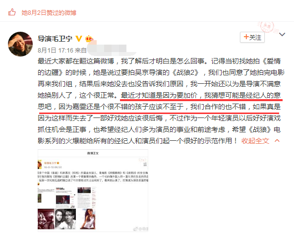 对此毛卫宁导演也发博表过态,他称徐嘉雯本来拍完《战狼2》之后就要进组和他合作拍摄电视剧《爱情的边疆》,但后来她突然说不拍了,他还以为是导演对她不满意,她被换了,后来才知道是因为加价的事情,但他觉得这应该是经纪人的意思,因为和她合作过后,毛卫宁导演觉得她不至于做出这种事情,他们的合作也挺愉快的,徐嘉雯也点赞了毛卫宁导演的这条微博。