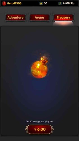 游戏中每进入一次竞技场就会消费1点体力值,体力耗费完毕只能慢慢等回复,15分钟回复1点非常缓慢,着急的就只能花钱购买体力回复剂了,而传说中的内容最丰富显得最有趣的“冒险模式(adventure)”模式则需要收集齐40片防御性英雄gazull的碎片才能开启,经过11773小编亲测,即便你再努力玩这款游戏,也是没有该英雄的碎片产出的,换句话说就是——游戏目前还没完成就已经匆匆上线想赚钱了,大家请耐心等待后续更新……