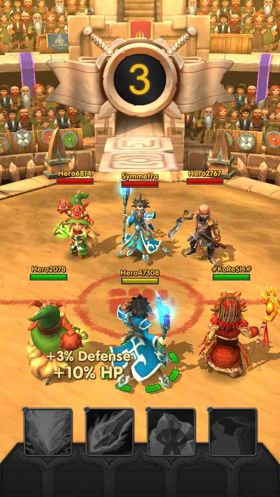游戏宣称可以和朋友一起在线冒险探索地宫并进行震撼人心的大海战,事实上……这些功能目前版本都没有开放!游戏默认可玩的仅仅是一个“竞技场(arena)” 模式,不过该模式目前不支持玩家自己组队只能通过在线功能随机匹配两位队友实现在线3v3对战,战斗胜利可以获得宝箱奖励,在奖励中会出现装备、英雄碎片等,当英雄碎片收集完毕就可以召唤出新的英雄并使用了,游戏中分为三种类型的英雄,分别对应攻击型、防御型以及辅助型,每种类型职业都有7位英雄可供选择。玩家即便在竞技场战斗失败也没有关系,同样会有一个安慰性质的劣质宝箱奖励,当然内里的奖品就非常的可怜了。