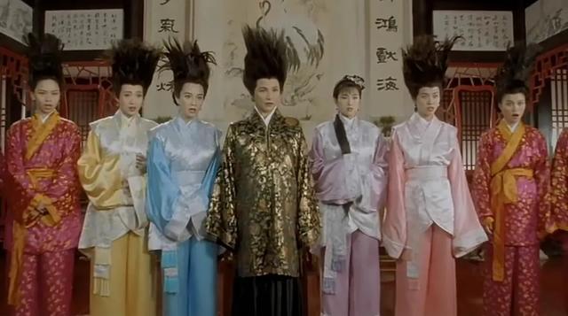 在影片中,有一个场景:周星驰饰演的唐伯虎来了一段“即兴说唱”,这时候华夫人和春香、夏香等人的头发都竖了起来,只有巩俐饰演的秋香发型不变。