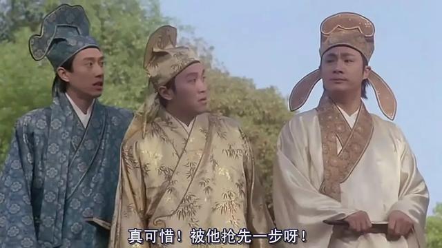 “如花”被唐伯虎一拳打进河中,三位才子指责唐伯虎不懂得“怜香惜玉”,在得知如花是男人后,祝枝山率先跳进河里去追,而吴镇宇饰演的文征明,摸着手中的扇子,非常遗憾地感慨:“真可惜!被他抢先一步!”
