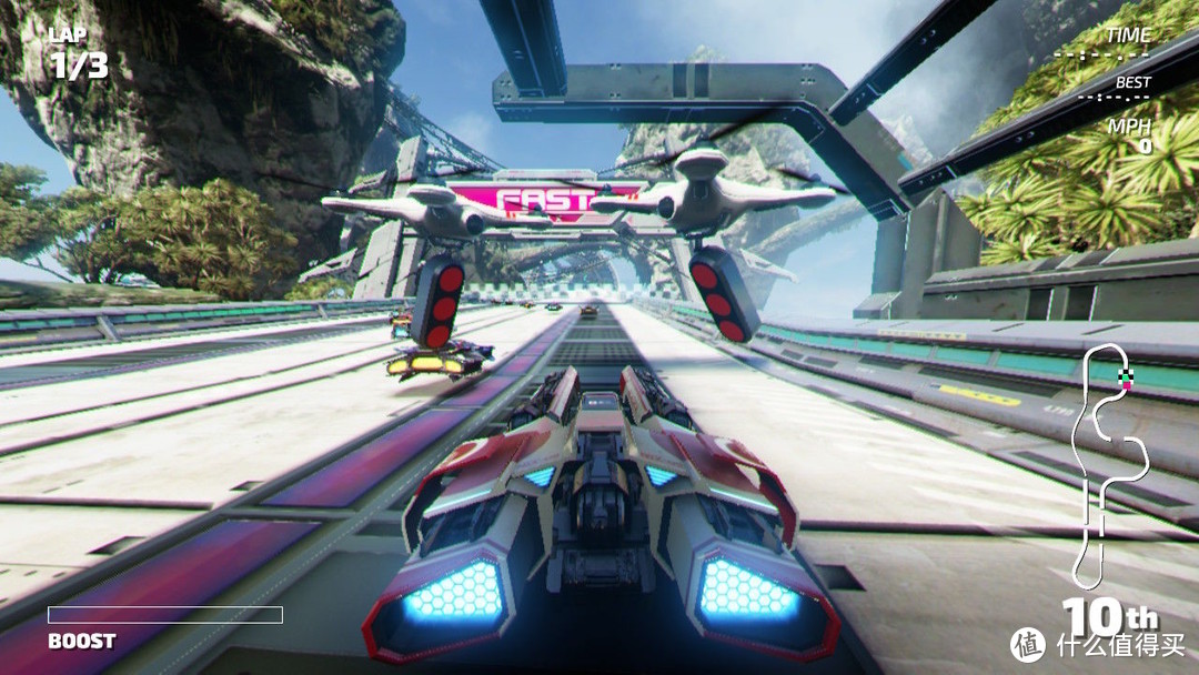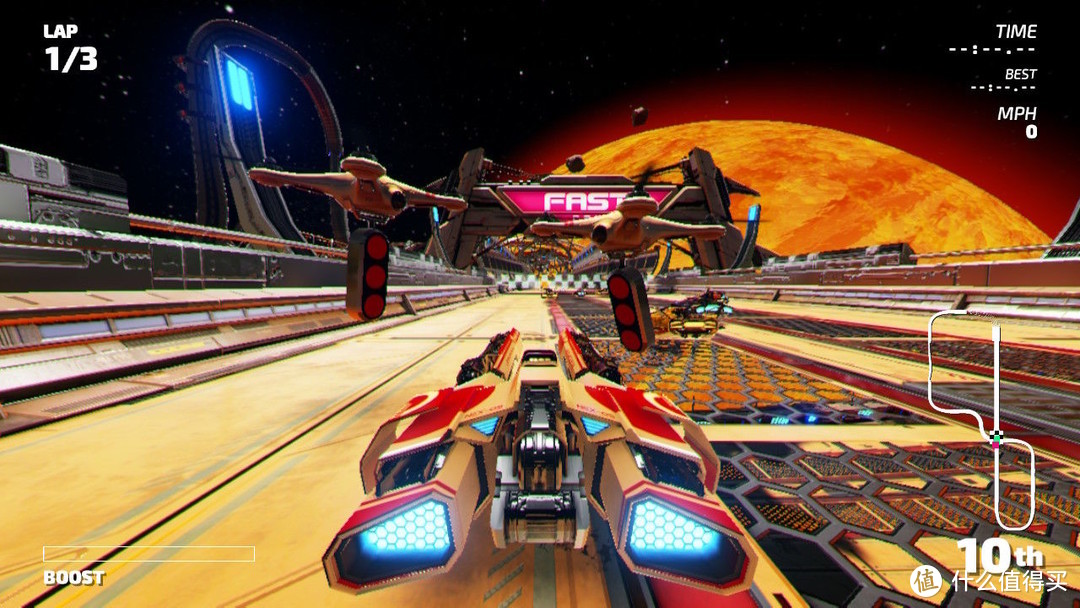 这款游戏只有下载版,它可以看成是 switch 上画面最好的赛车游戏,全程稳定 60 帖运行。游戏架空未来世界的设定让我觉得挺新鲜,所以这里的车都是磁悬浮的。跑起来速度感比传统赛车游戏要加很多,配合上各类光影特效及 hd 震动,游戏的时候让人心跳加速,可以作为消遣小游戏偶尔让刺激一下精神不好的自己。另外游戏小归小,但各大场景做得一点不含糊,从空间站到未来都市,从大沙漠到恒附近,这些场景在强烈的图形技术表现下让人沉浸其中。边比赛边听着音乐享受科幻美景,不失为一种乐趣。