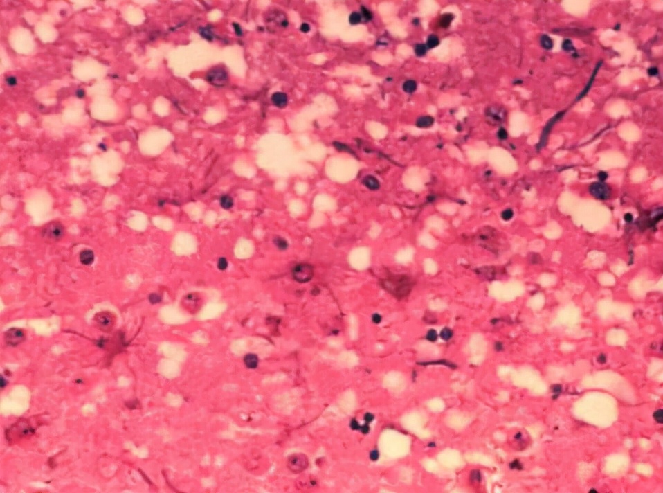 于是科学家就准备从这里入手,开始调查,科学家将病人的脑组织,放在显微镜下进行观察。发现这些脑组织中有着无数的小孔,看起来就像是海绵一样。