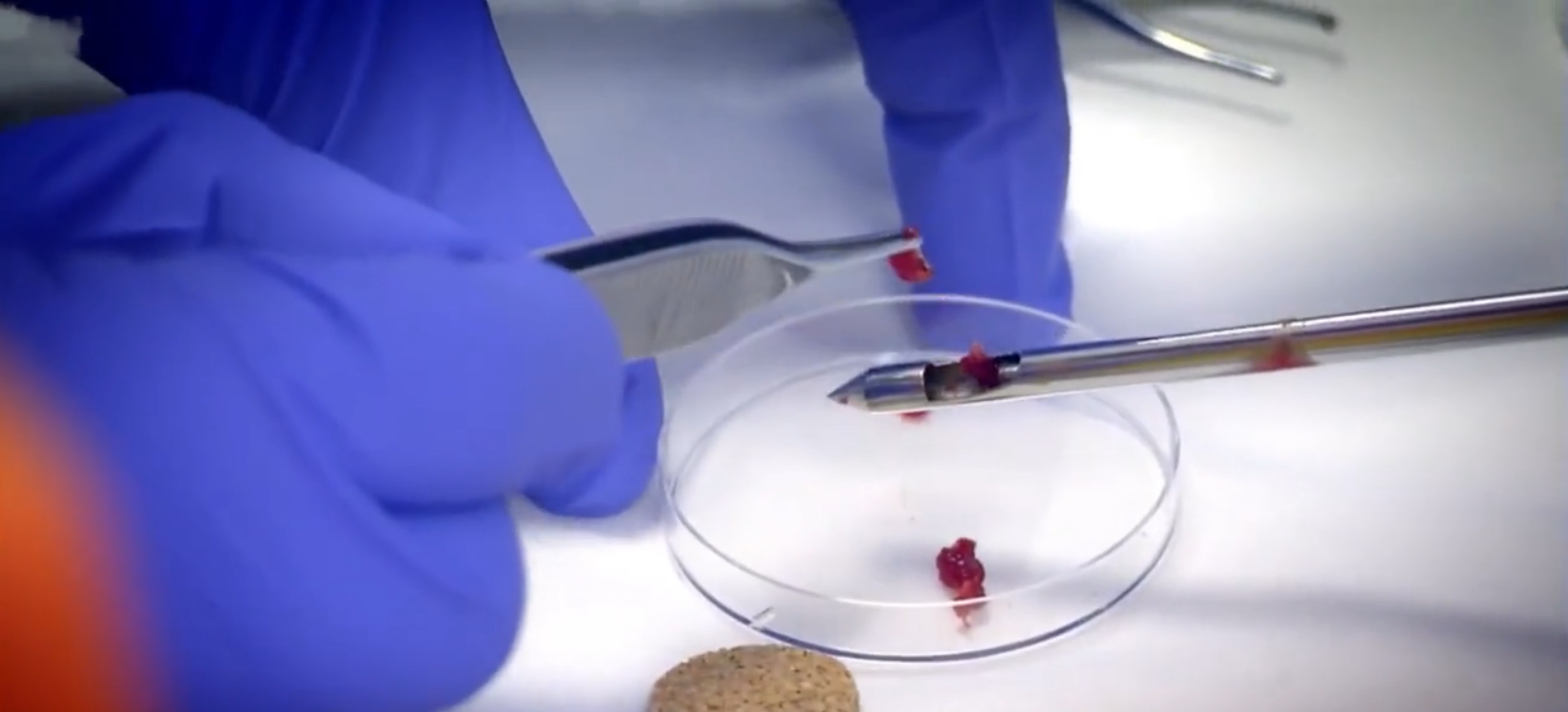 就算是吃自己的肉也不行,所以小哥并没有吃下自己的肉,但是为了体验一下“人肉”的感觉,于是他凭借着“人肉”样本中提取到的味道。买来了猪肉和鸡肉,将它们混合起来,烹制出了最接近“人肉”味道的肉饼,又做成了““人肉”汉堡”的样子。