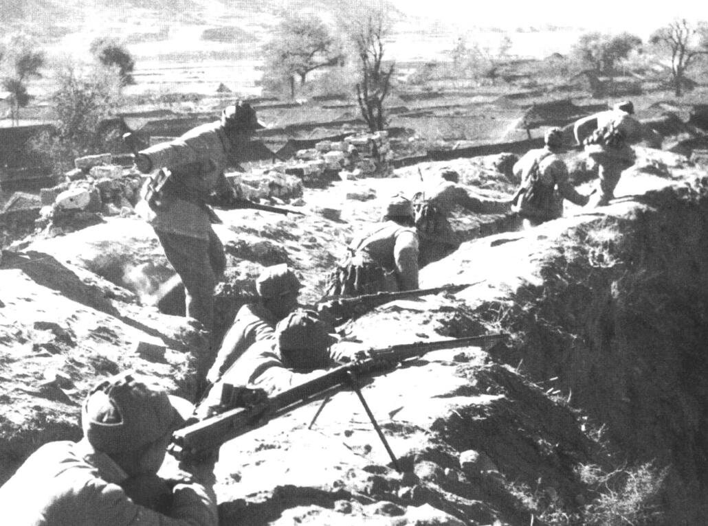 等放翻了这四个敌人,四班长朱万才,瞅见自己班的一个战士被敌人已经给压到了,四班长也顾不得许多,冲过去对着这个敌人的后背就是一个背刺。