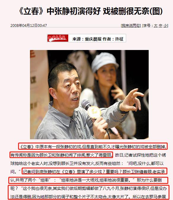 在电影的发布会上,记者追问蒋雯丽和顾长卫,为何删掉张静初的戏份。