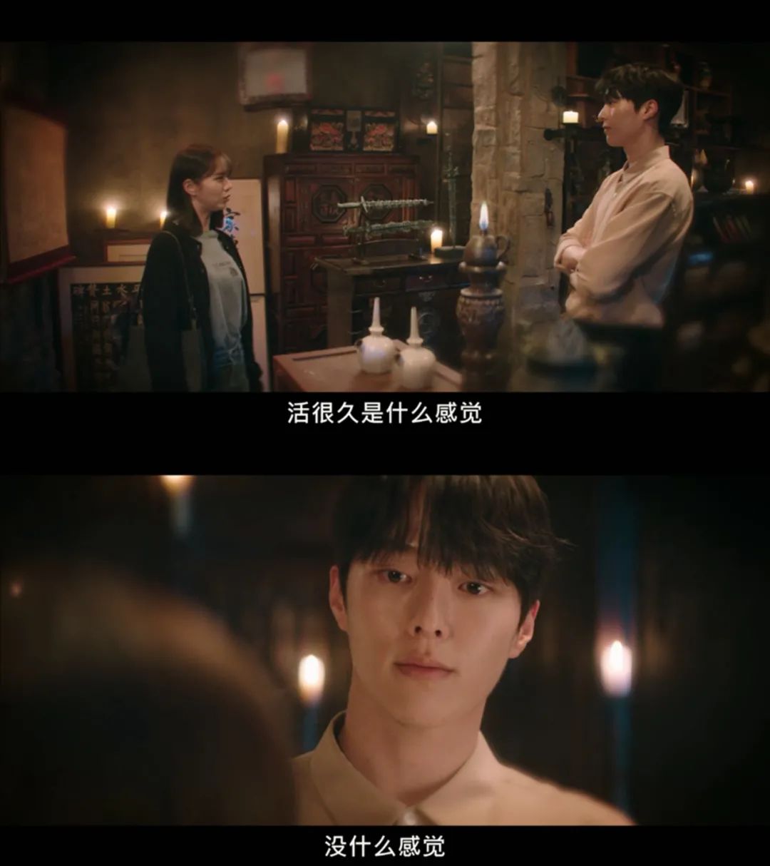其次是有奇幻感。韩剧制作奇幻题材多了后,暴露了一个问题,来来去去那些梗,居然没有了奇幻剧最重要的奇幻感,奇幻感这个东西吧,又带点浪漫主义色彩,《心惊胆战的同居》导演居然表现了一些出来,李丹跟申又如在地下室看到他漫长岁月里攒下来的很多东西,一起去谈论历史,申又如梦里回忆到几百年前的恋人,以及明明是当年留下来的一盏风铃,他却骗李丹说是7500韩元买的装饰品,送给了她。