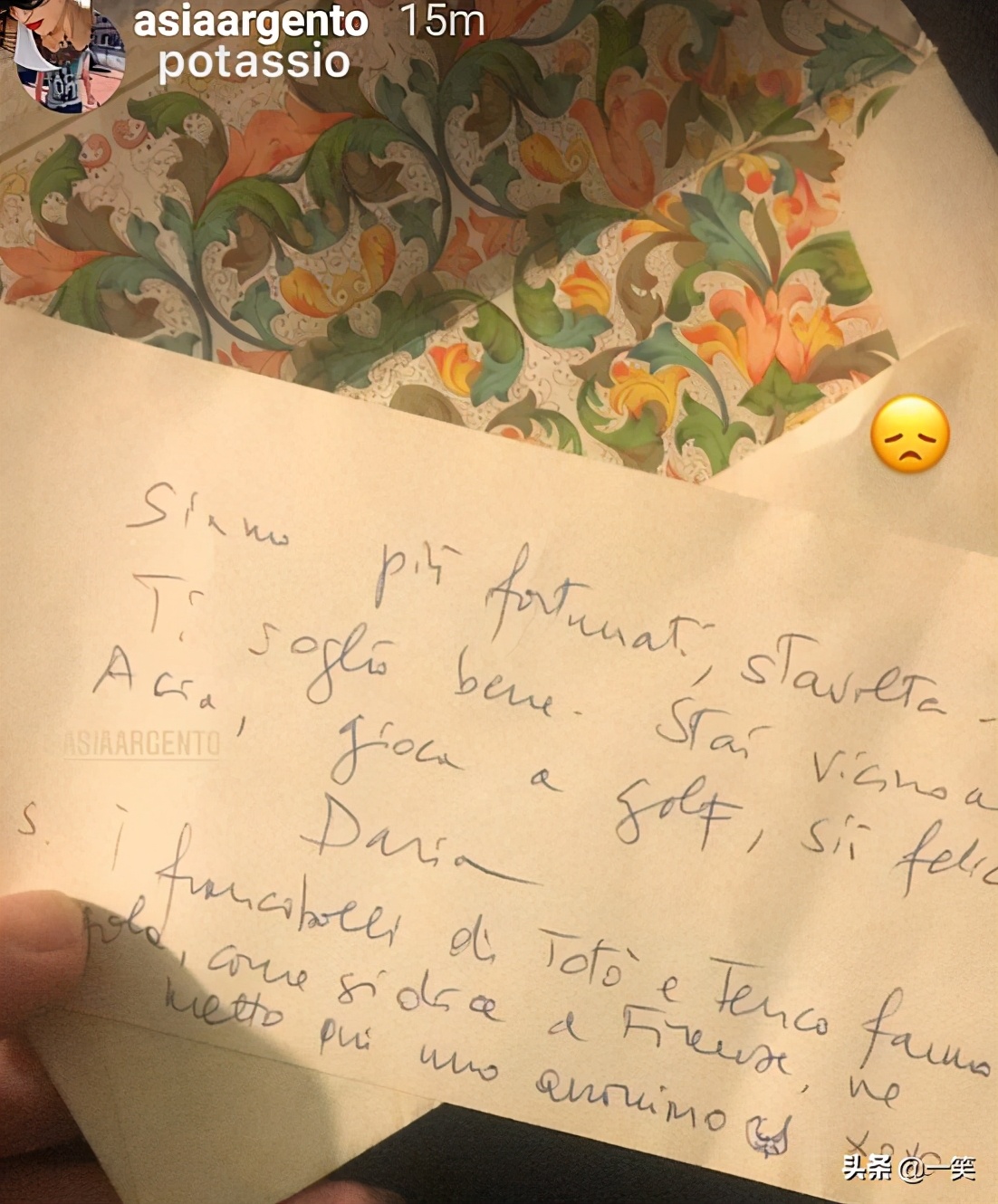 “没有了您,我也不会停下脚步,我感到我失去了唯一的人生参考点。我与所有认识和爱过您的人都很亲近,我永远是您的asia argento”