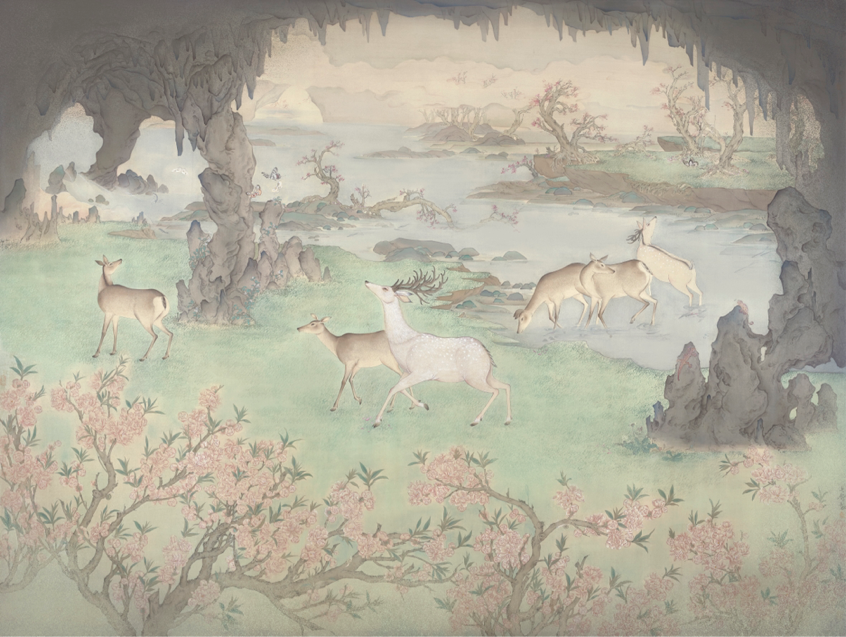 作品名称:《鹿野乡》指导老师:谢青 岳黔山 陈相锋 张弓作品尺寸:150cm*200cm作品材料:绢本设色