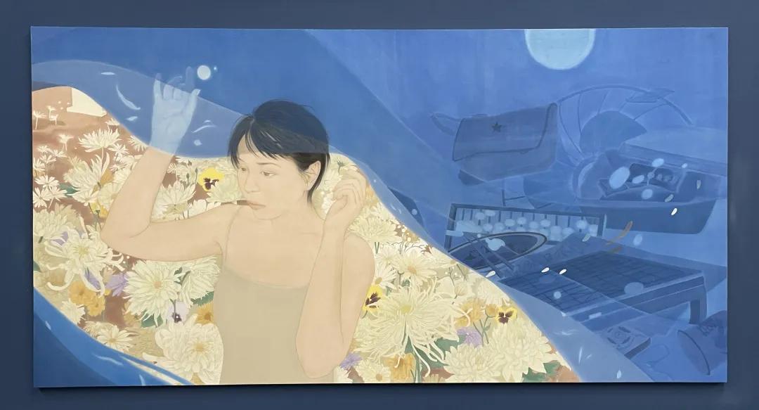 作品名称:《花月夜》指导老师:焦洋、张猛、徐华翎、金瑞作品尺寸:75cmx150cm作品材料:绢本设色