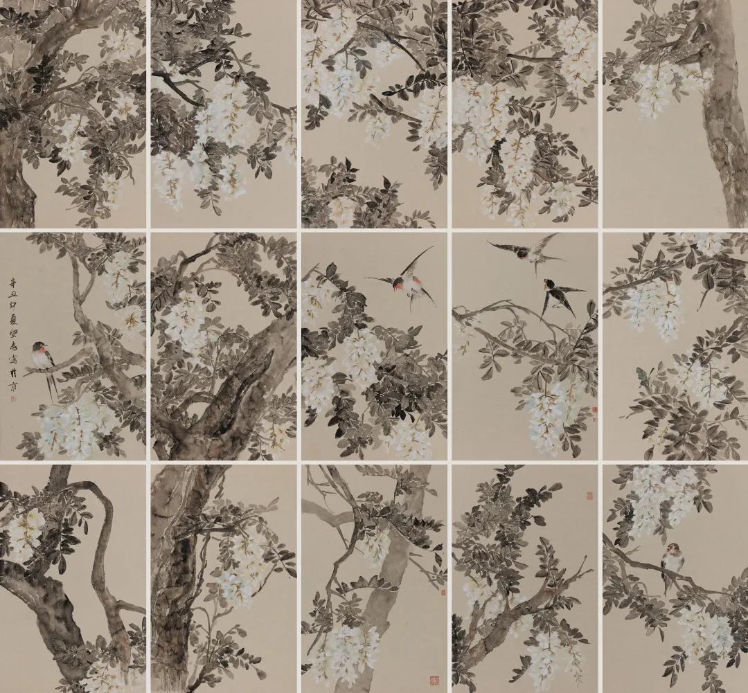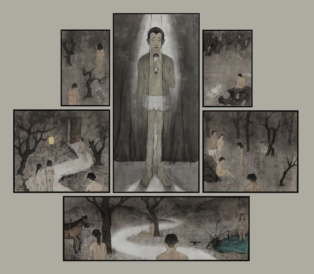 作品尺寸:123cm*95cm、(39cm*69cm)(39cm*35cm)(39cm×55cm)(65cm×5cm)、40cm*62cm材料:纸本水墨